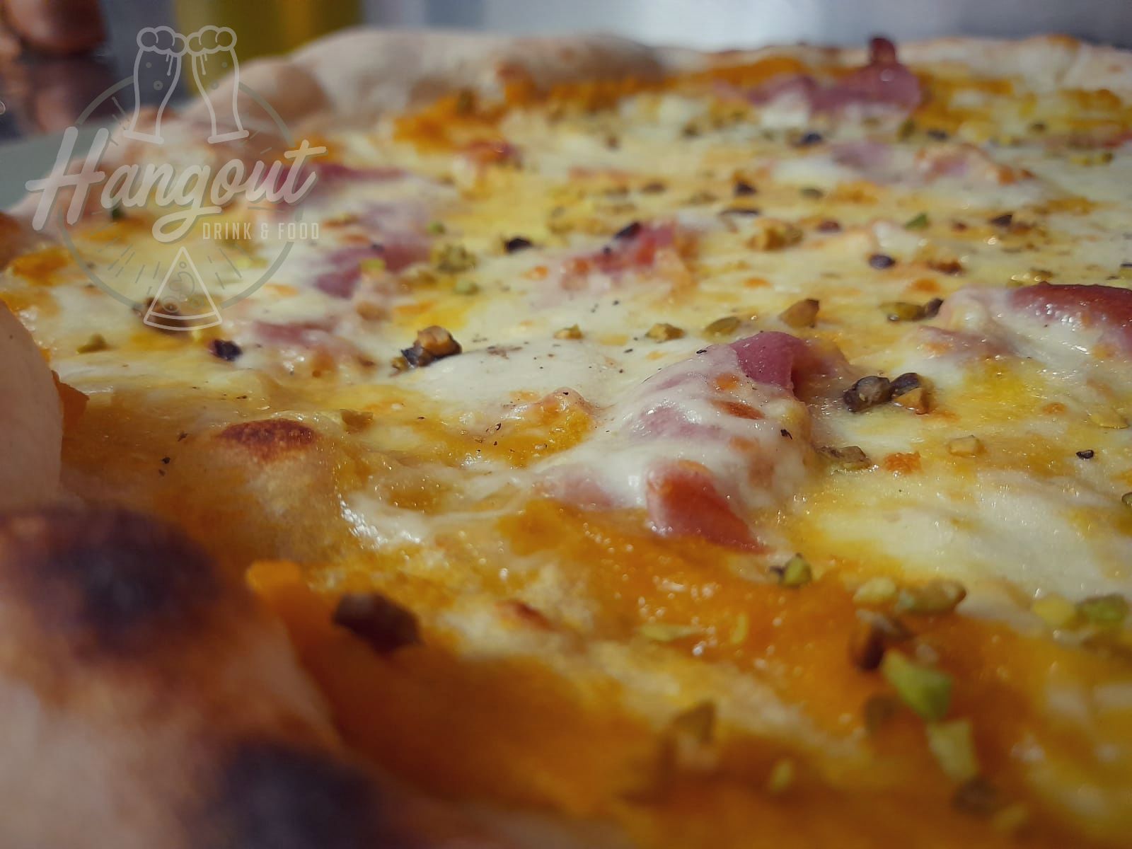 La combinazione della crema di zucca, il fiordilatte, lo speck, i tocchetti di scamorza, il pepe nero macinato fresco e la granella di pistacchi rendono questa pizza "MOSTRUOSAMENTE" buona